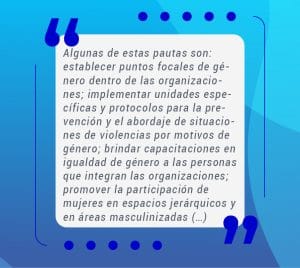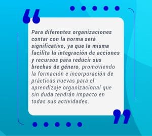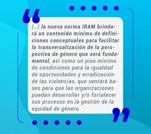 Esta norma se propone ayudar a las organizaciones, también de todo tipo, a que puedan establecer un sistema de gestión de EG, adoptando la estructura de alto nivel, es decir, que se podrá acoplar fácilmente a otro sistema de gestión existente. Su estudio comenzó por iniciativa del Ministerio de Desarrollo Productivo que nos acercó una primera propuesta. Luego, se conformó la Comisión Gestión de la Equidad de Género que comenzó a trabajar en este documento desde agosto del año pasado.
